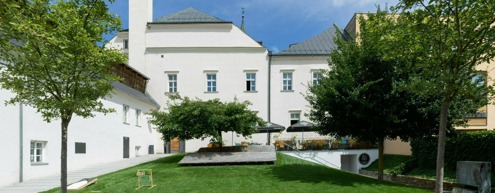 Na svažitém pozemku zhruba čtvercového půdorysu tak vznikl geometricky rozdělený intimní prostor, kombinující zatravněný čtverec s dřevěnou zvlněnou odpočinkovou plochou. Trojice přírodních povrchů jej rozděluje do užitných zón sloužících jako venkovní terasa restaurace a odpočinková zóna pro veřejnost. Dvůr je vybaven moderním autorským mobiliářem, zahrnujícím kromě výše zmíněné dřevěné odpočinkové plochy i lavičky a vodní prvek v podobě kašny komorních rozměrů. Celá kompozice je doplněna sadbovou úpravou podle projektu Evy Wágnerové, využívajícího především nízkou stromovou výsadbu v kombinaci s popínavými rostlinami porůstajícími obvodové zdi.